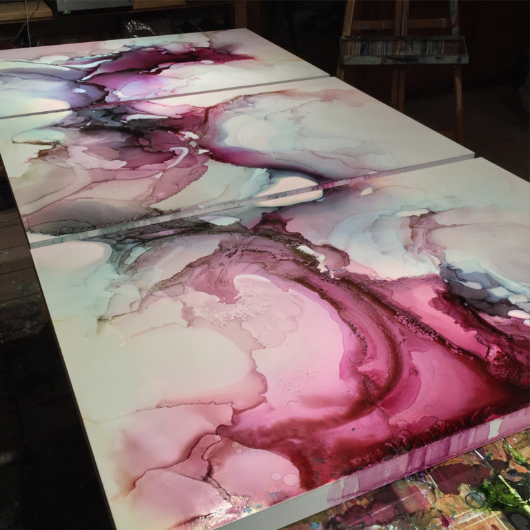Andrea works primarily on Ampersand’s Claybord. She says, “Claybord is my favorite because it can be used in so many ways. There’s just nothing else like it. The clay coating is perfectly smooth, so it is fantastic for drawing and painting delicate lines. “She continued, “I also love Encausticbord , Aquabord, and the Primed Smooth Artist Panel.” She uses dye based pigments miscible with alcohol, pigmented inks miscible with water and acrylic paint. She works with her personally developed system that includes a carefully mixed color palette, paint pours and drawing. The evolution of the artwork happens sometimes as the panel is flat and other times on the easel. Upon completion, Andrea finishes her work with a system of varnishes to protect the work from ultraviolet light, abrasions, and airborne pollutants.