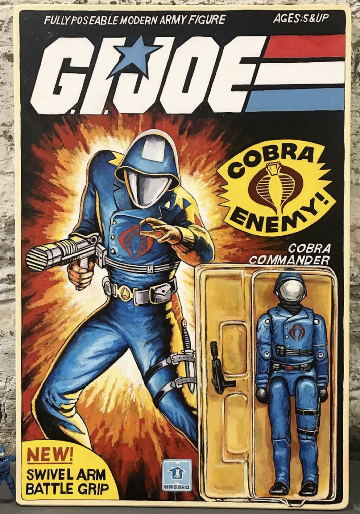 A: A couple stand out. A year or so back I was commissioned by John Cena. My work ended up in front of him via a good friend and shortly after he hired me to create a giant GI Joe / Cobra Commander action figure painting. Emulating the sealed figure on its blister card. There was quite a response to finally sharing that. Wild stuff; lots of fun.