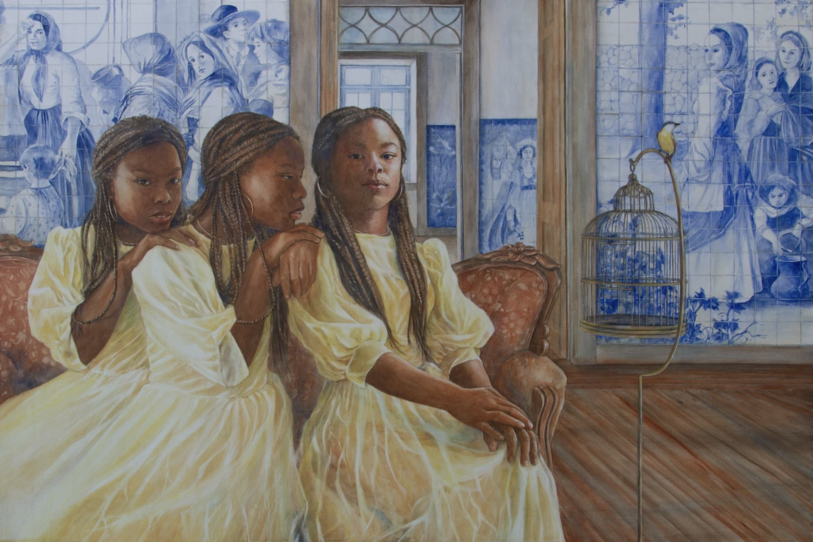 After the girl was removed from our house, I fell into sadness and made three paintings inspired by her and her story. It was like she was still here with me. Still, I couldn’t live in the past and feed the sadness, so we took a trip to Portugal, where part of our family lives. This connection with the past, my grandparents’ past, was like getting back to my roots. It made me get up again and change my perspective on my paintings. Then I started to include other elements in the paintings, like the tiles and the swallows, that are very Portuguese and common in Brazil.
