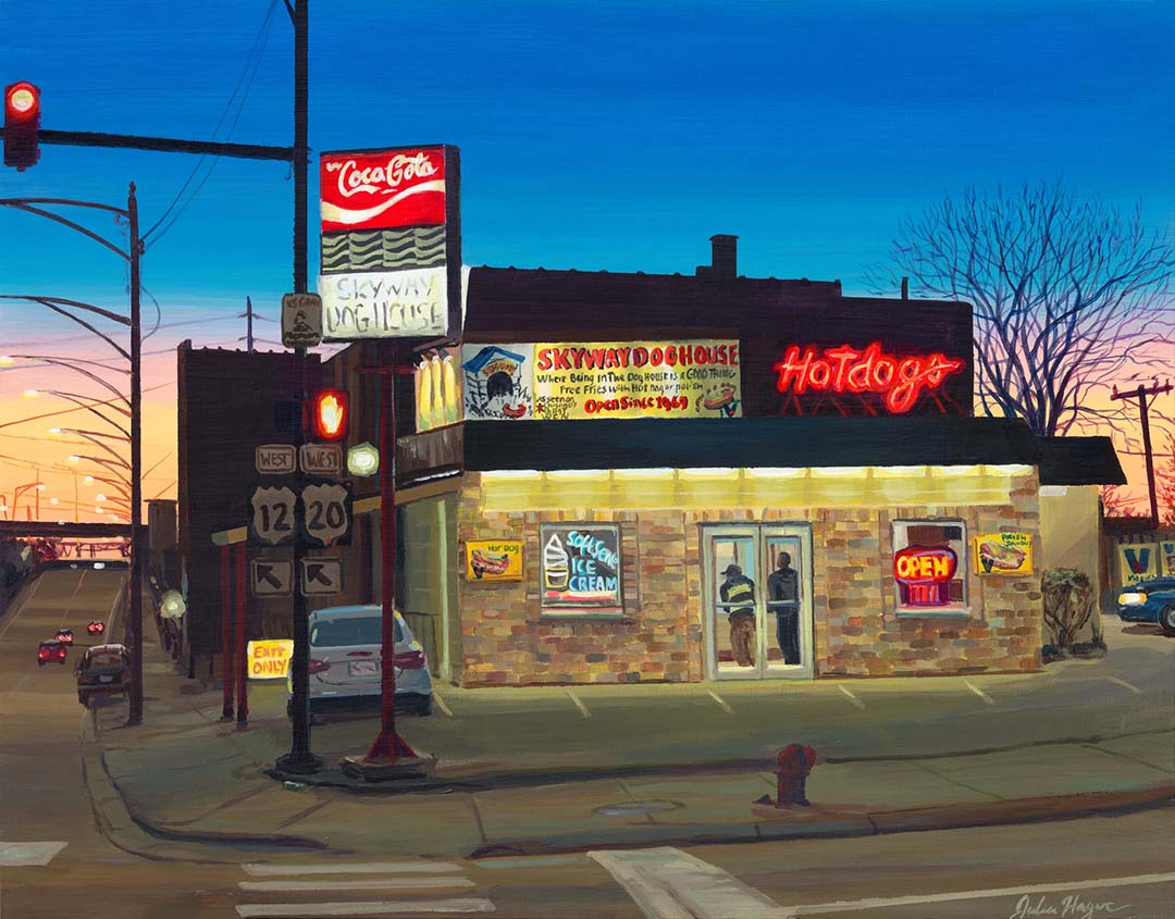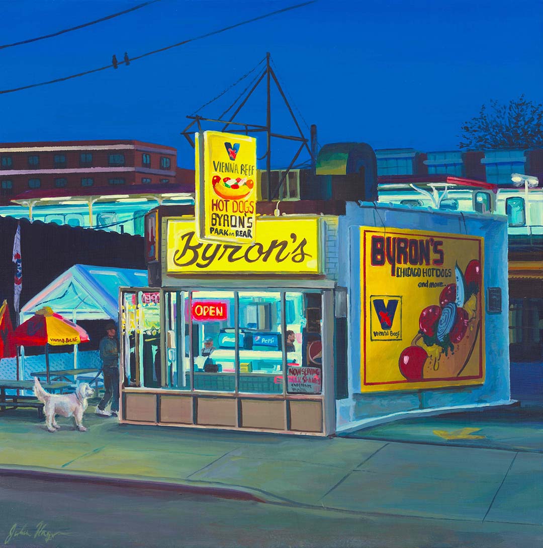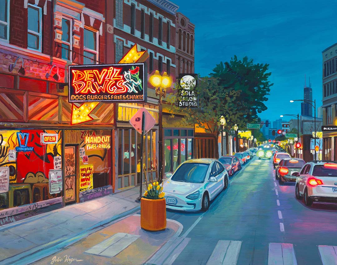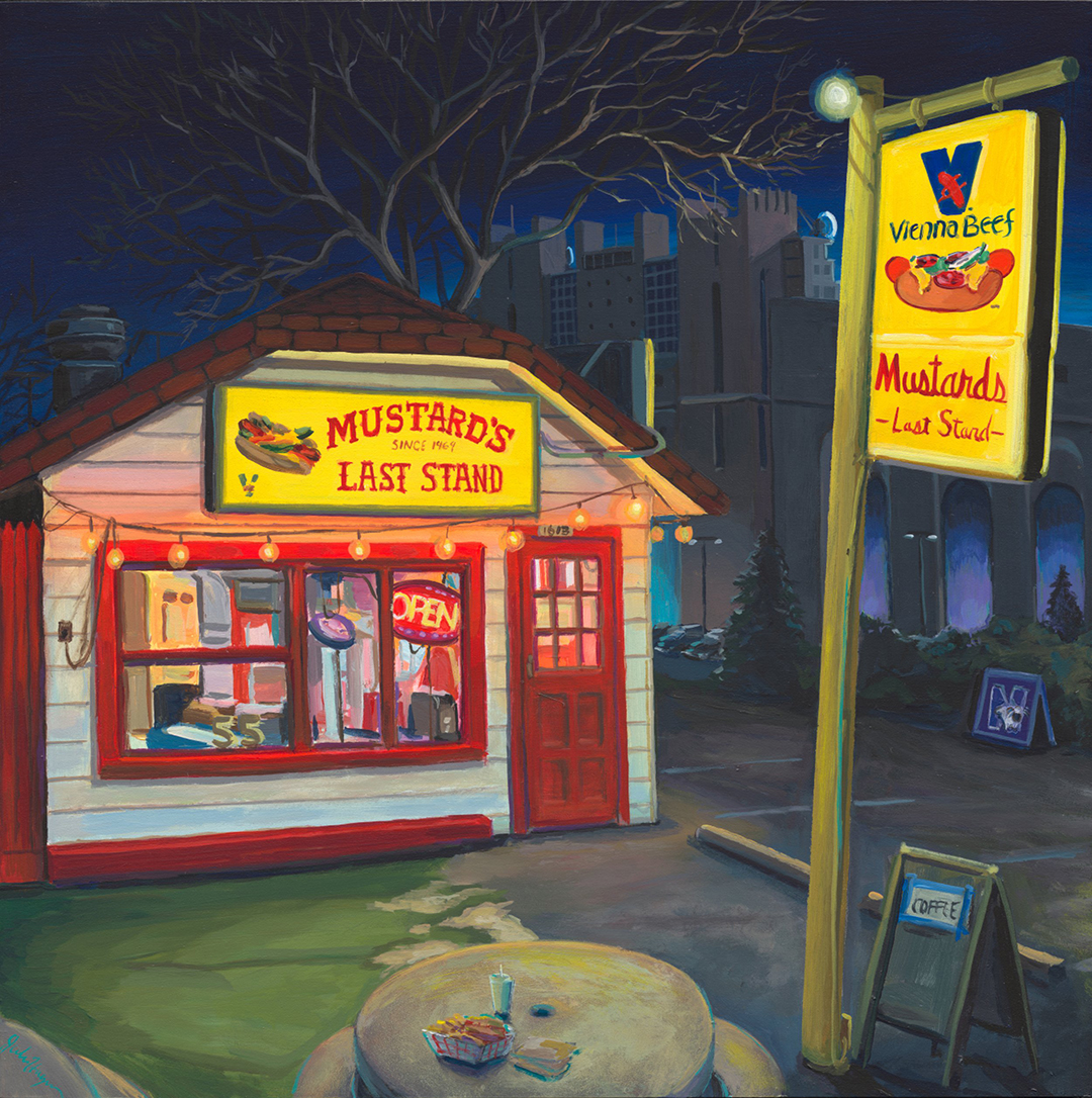 I have so many! It’s hard to choose just one, but within my latest series, Every Last Stand, where I’m chipping away at capturing as many Chicago hot dog stands as I can, I’m especially looking forward to painting Lu Lu’s Hot Dogs. Outside of hot dog stands, I often pass by Diversey River Bowl—it has amazing signage and a city view in the background, and I think it would make for an excellent painting. Chicago has a lot of unique bowling alleys, and I want to turn that into a series at some point.