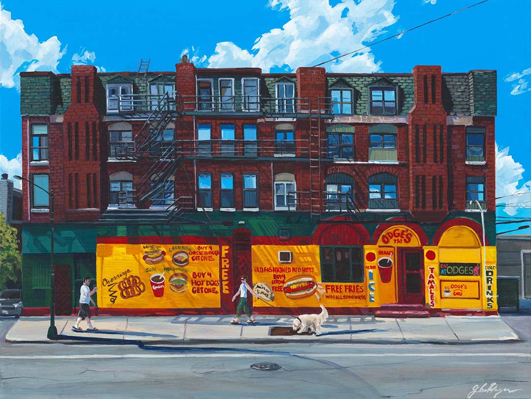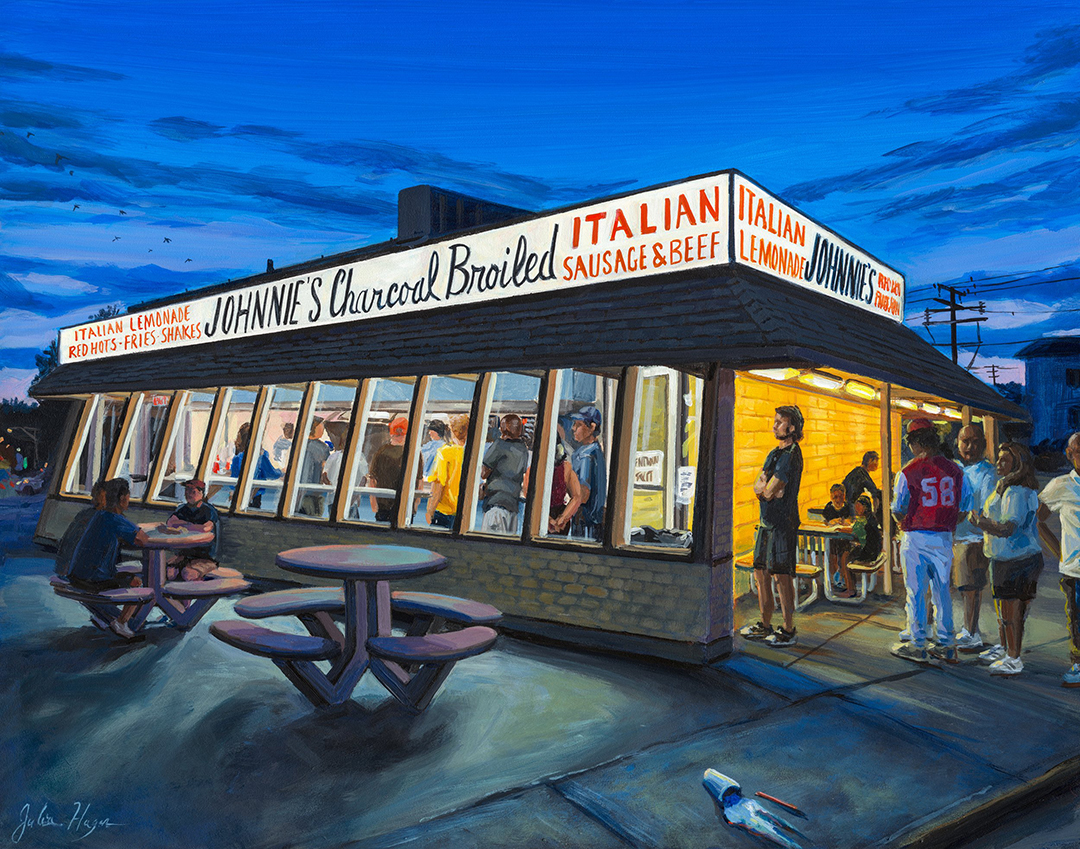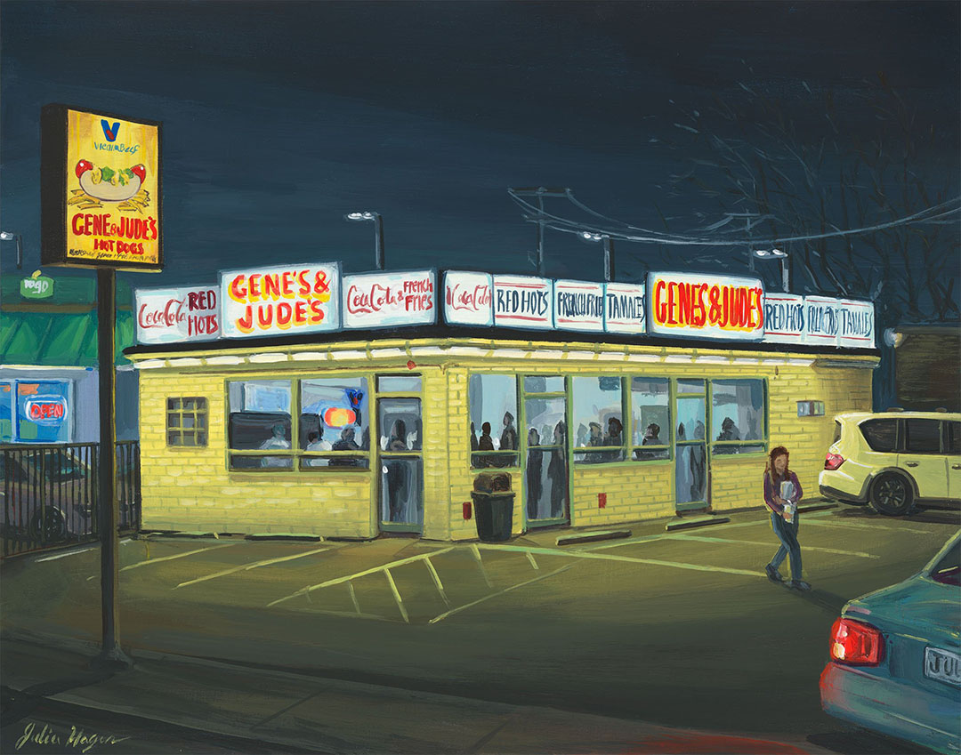 Absolutely! It’s a very important part of the research and informs the painting process. I’m partial to the Depression-style dog, which comes complete with a bun, hot dog, mustard, relish, onions, sport peppers, and extra salty fries rolled up with the dog. It hits the spot every time!