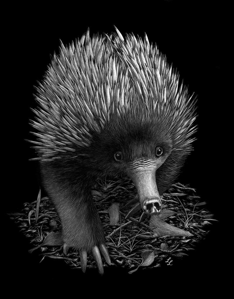 Well, it was always a choice between studying environmental science and art after I finished school, and I was swayed by the steadier income opportunities for an environmental scientist versus an artist. This decision allowed me to find employment that would go on to support further studies in my other passion, art. Studying Natural Resources opened my eyes to the natural world, the interconnectedness of ecological systems, and everything that lives within them. It gave me lots of practice in researching and observation (e.g., studying plants, animal pelts, and specimens and relating them back to why they may have evolved that way based on the environment they grow or live in). I apply this kind of thinking to my artworks because I like to know that what I’m creating makes sense. I love creating form on my scratchboard works and love realism, so close observation of the subject and a little bit of research goes a long way in producing a good result.