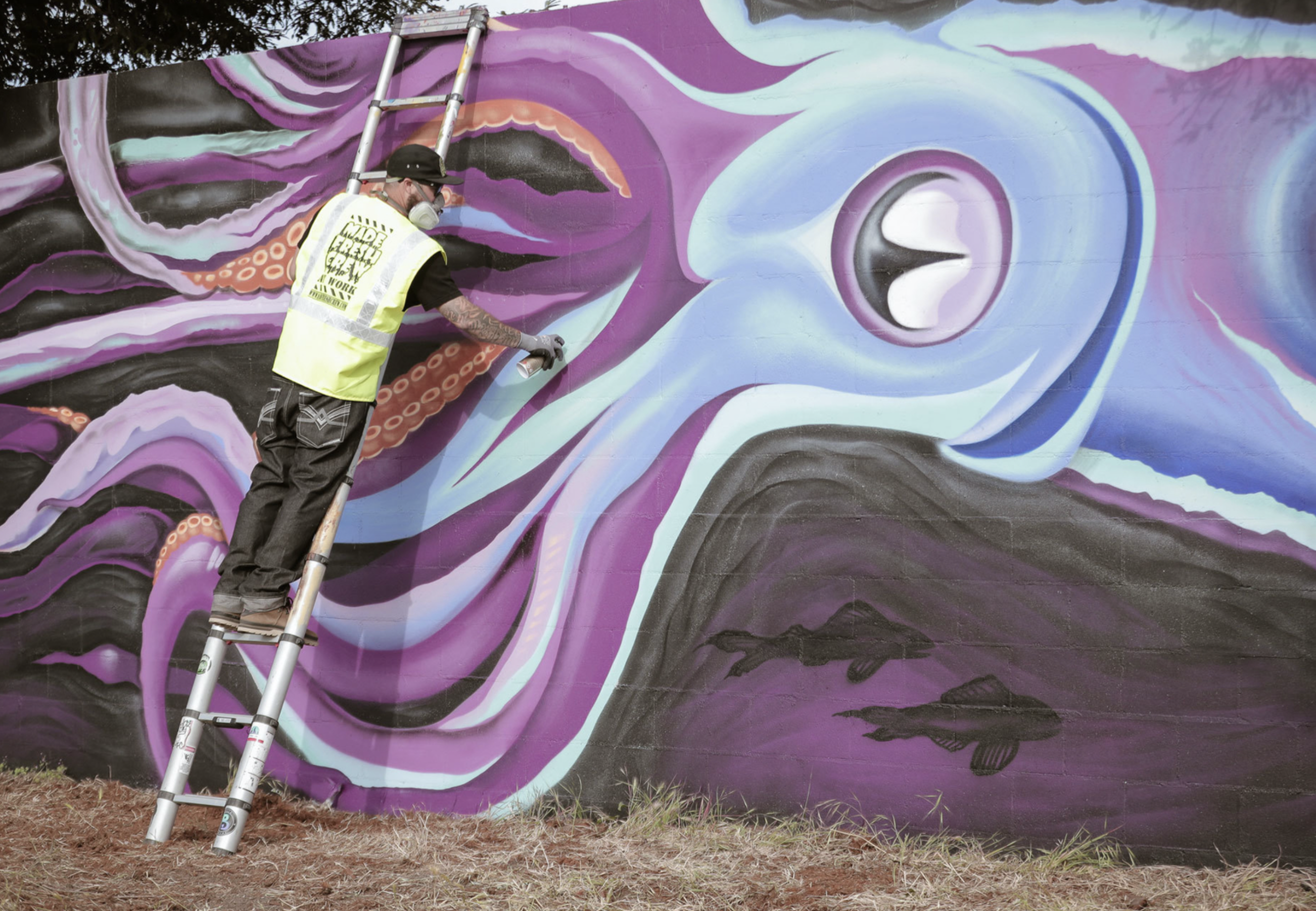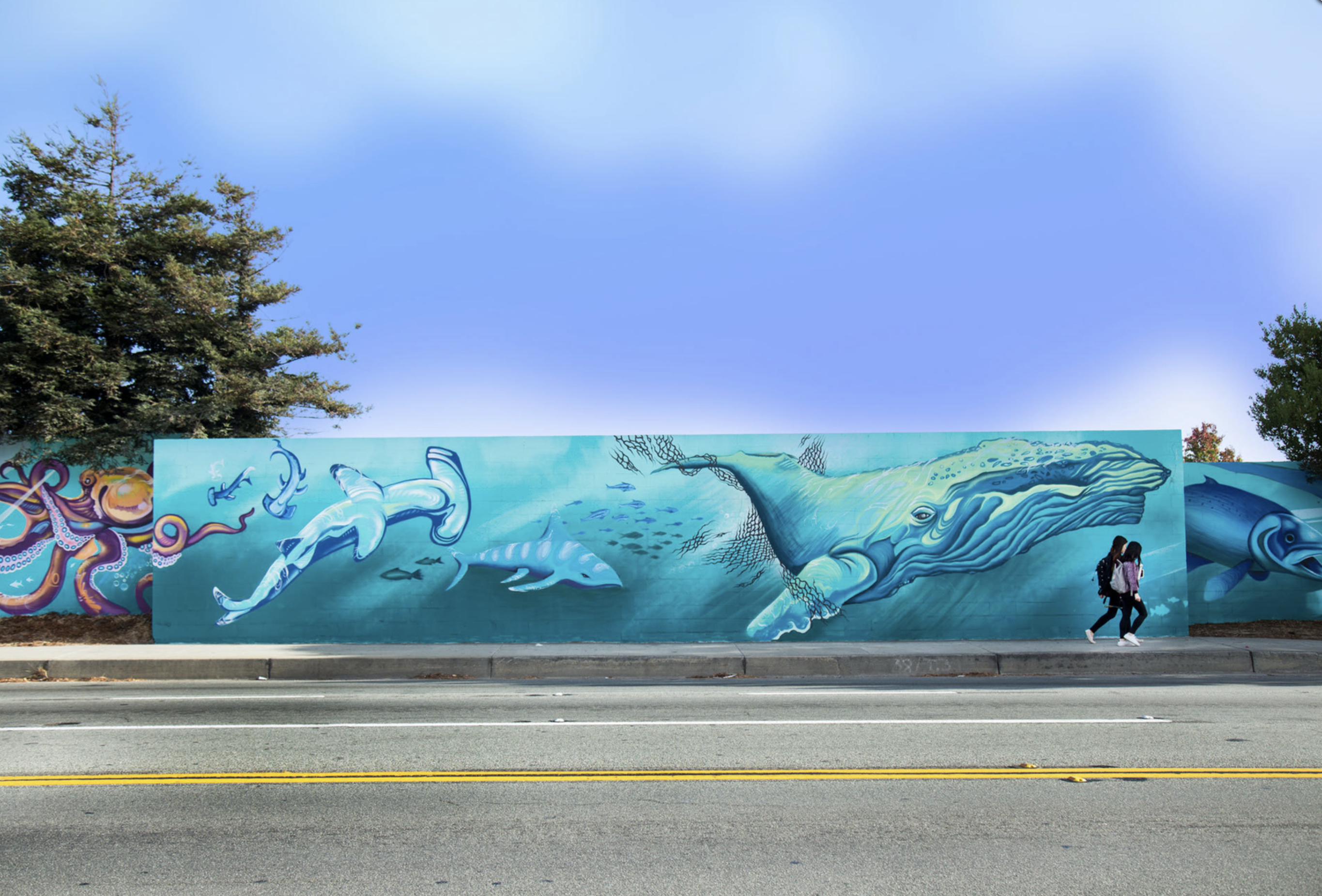 A: That project was unlike any other mural for me because of all the footwork it took to make a project of that scale come to life. I worked with the City of Santa Cruz, Cal Trans, School District, Economic Development, and Clean Oceans International for two years. We wrote grants with the city, local foundations pitched in, and just over 1400 individual contributions from the local community. We worked with the students at Bay View Elementary to pick the species most affected by plastic pollution in our Monterey Bay. Working with my ten best friends to paint the largest mural in our town has been one of my favorite moments of my life.