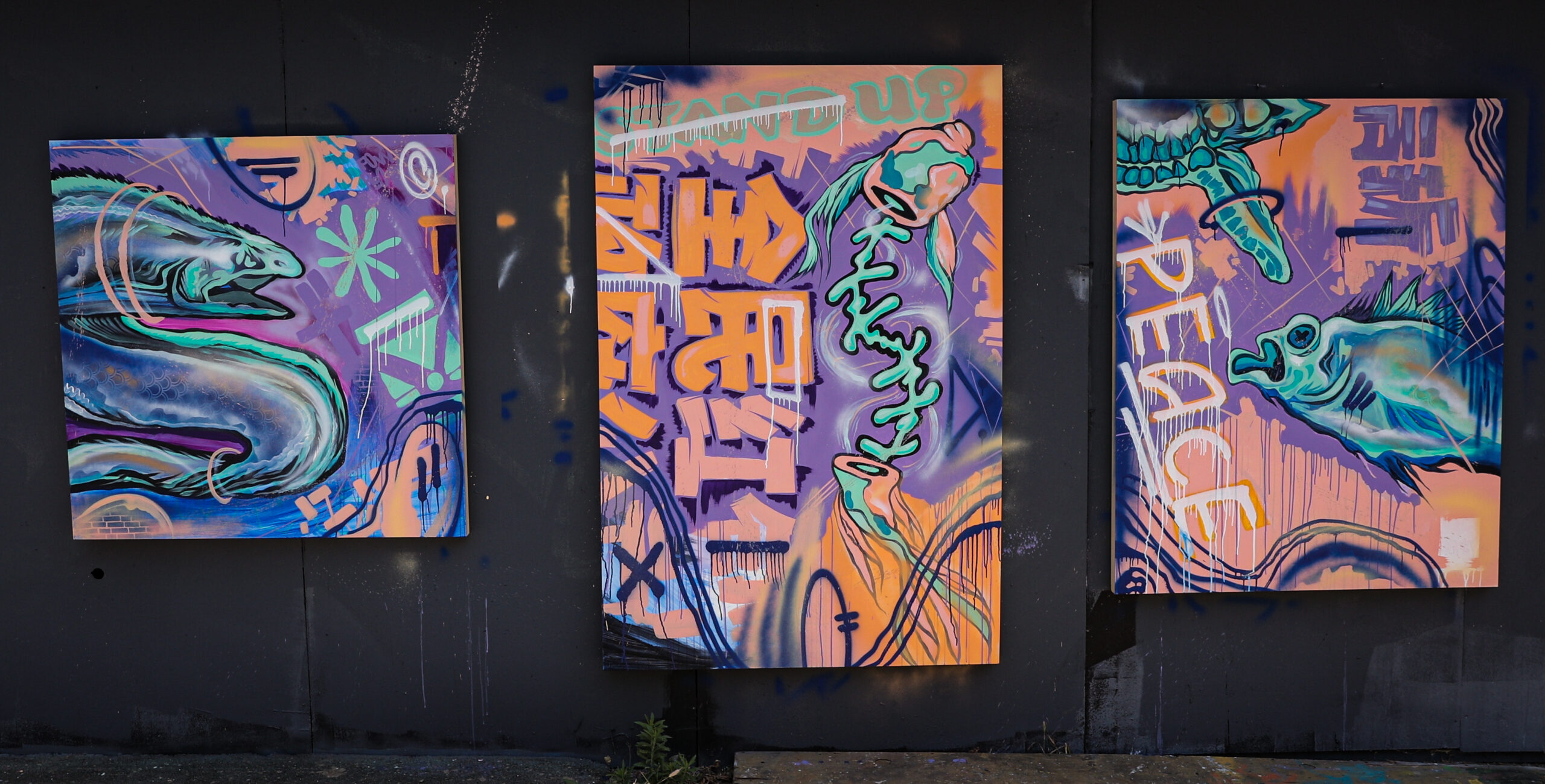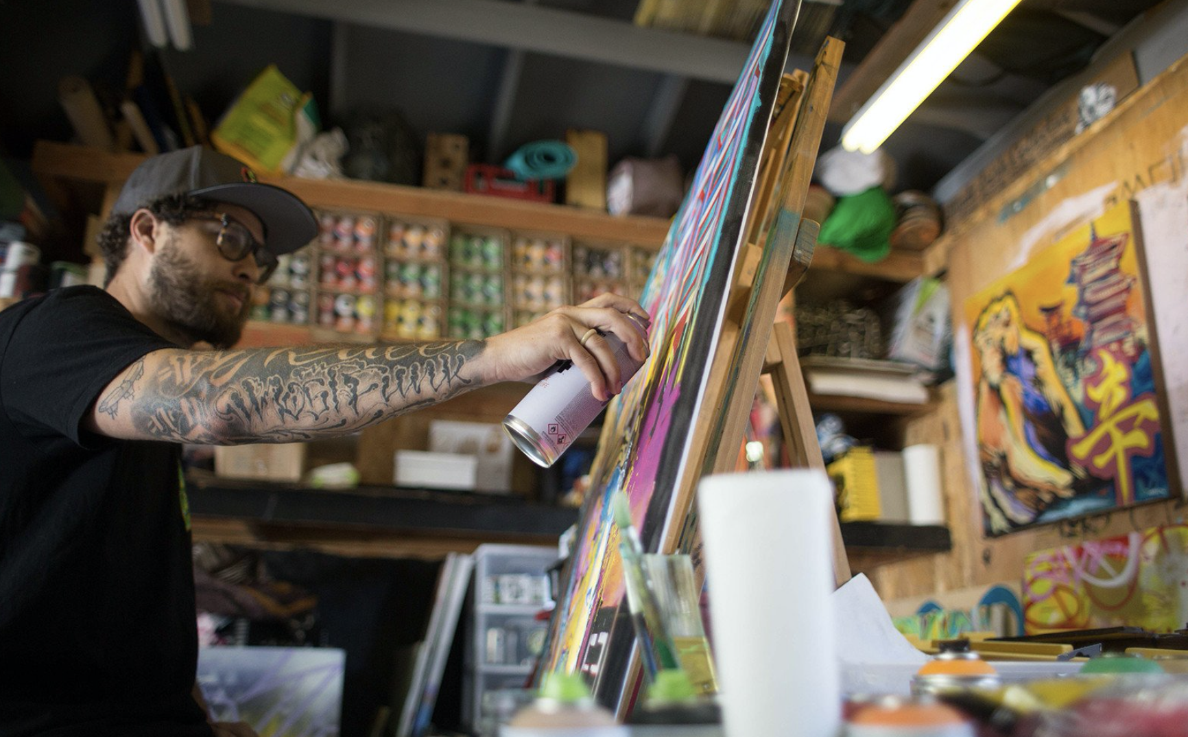 Taylor Reinhold was born and raised in Santa Cruz, California, and attended Santa Clara University. In 2011, he was granted a National Endowment of the Arts Award to co-curate the first-ever Urban Arts Festival in Watsonville, California. The event aimed to educate youth about sustainable art, public murals, and silk screening. Since then, he has taught art and mural classes for Mariposa's Art and created multiple community-based art projects in the County of Santa Cruz. Perpetually creating, Reinhold currently designs and produces original, handmade clothing and wearable art with fellow skilled artists in the Made Fresh Crew art collective. In addition to producing clothing, Reinhold also enjoys painting and silk screening on objects from the urban landscape, such as recycled spray cans. He has an unrelenting passion for creating art and beautifying public spaces. Reinhold has found his calling in painting murals and continues to paint around the Bay Area. He has been contracted to do large-scale installations for Burning Man, Plantronics, Comcast, and LinkedIn with a couple more in the works. In 2017, Reinhold teamed up with the new sock company Merge4 to have his designs printed on socks. He currently has eight different sock designs, two of those being woman’s socks. Check out his socks here. He is an artist on the rise, featured as a Spotlight Artist in the 2018 Art Expo Las Vegas. To see more of Taylor's work, visit his websites taylorreinhold.com and madefreshcrew.com, or Instagram.