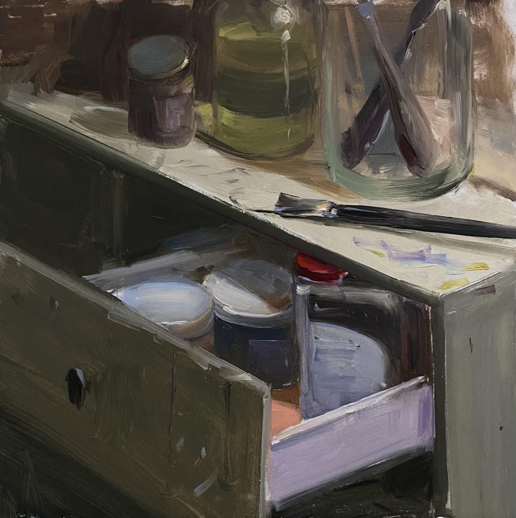Artist Studio, Open Drawer, 20x20cm, oil on Ampersand Gessobord