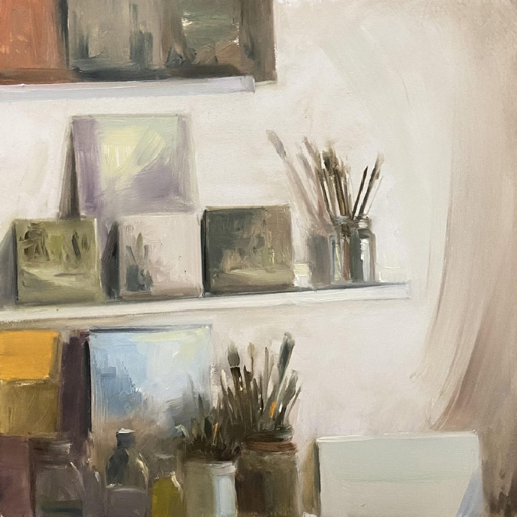 Drying Shelves in the Studio, 20x20cm, oil on Ampersand Gessobord
