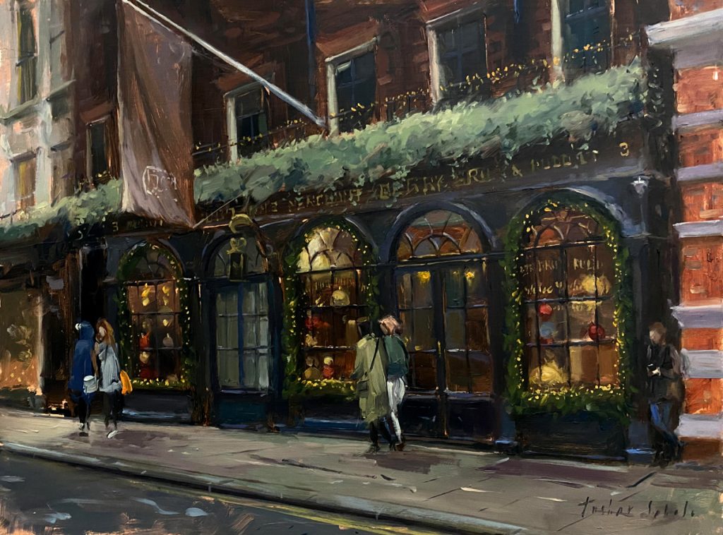 Having studied architecture, I am naturally drawn to buildings. I love painting cityscapes, and London has some of the greatest streets and buildings to paint. Architecture knowledge has helped me understand drawing, space, perspective, scale, and proportions. Knowing a structure’s architectural history helps me emphasise important nuances and features in my works that define a particular period. My years of working as a product designer have given me a greater understanding of materials, light, colour, and form, which assists me immensely when painting any street furniture, lamps, buses, or taxis in my cityscapes.