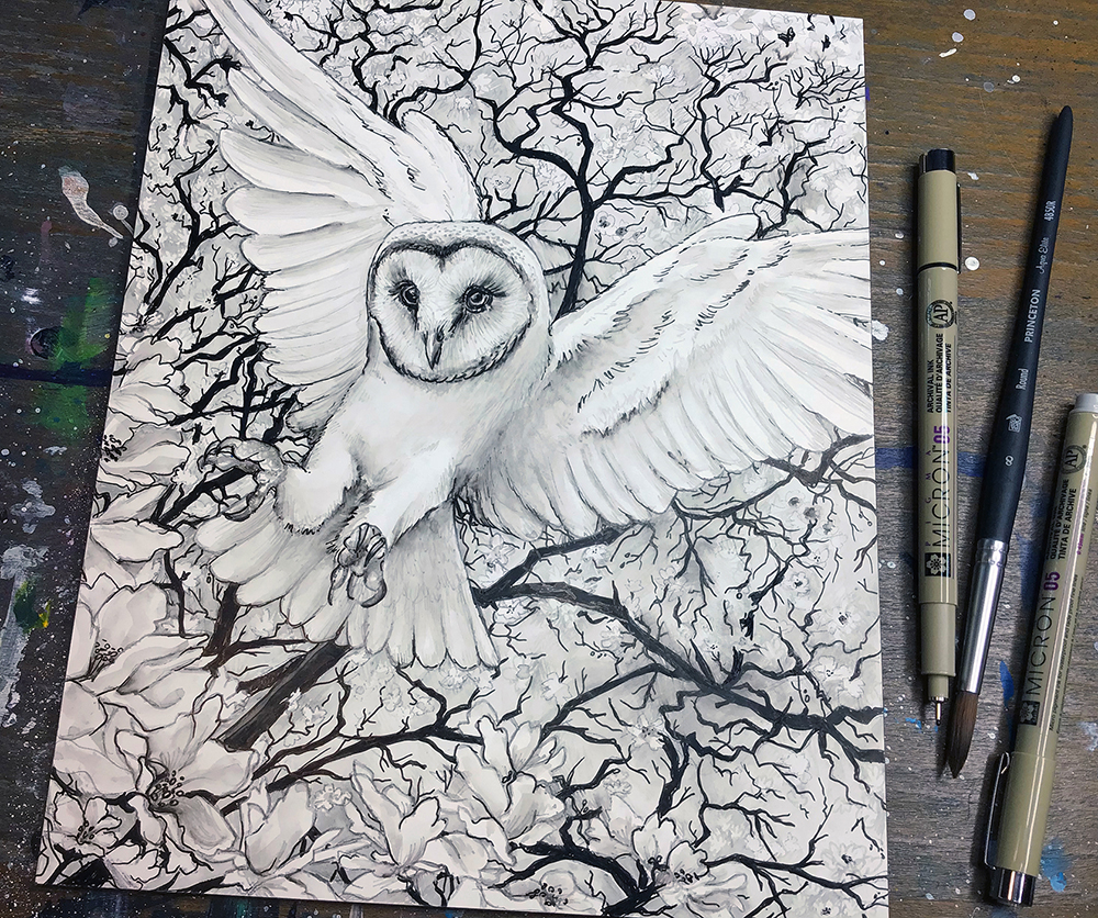 Lately, I’ve been playing around with layering frisket, watercolor, and colored pencils on Aquabord. Because my illustrations have so many layers, working on a more durable surface that can take a lot of both paint and dry mediums is beneficial. Also, using Micron Pens on Claybord feels like drawing with liquid pearls. It’s so smooth, and when you add a wet brush, you can get such flawless blends! Can you tell I’m a bit of an eclectic art addict yet?!