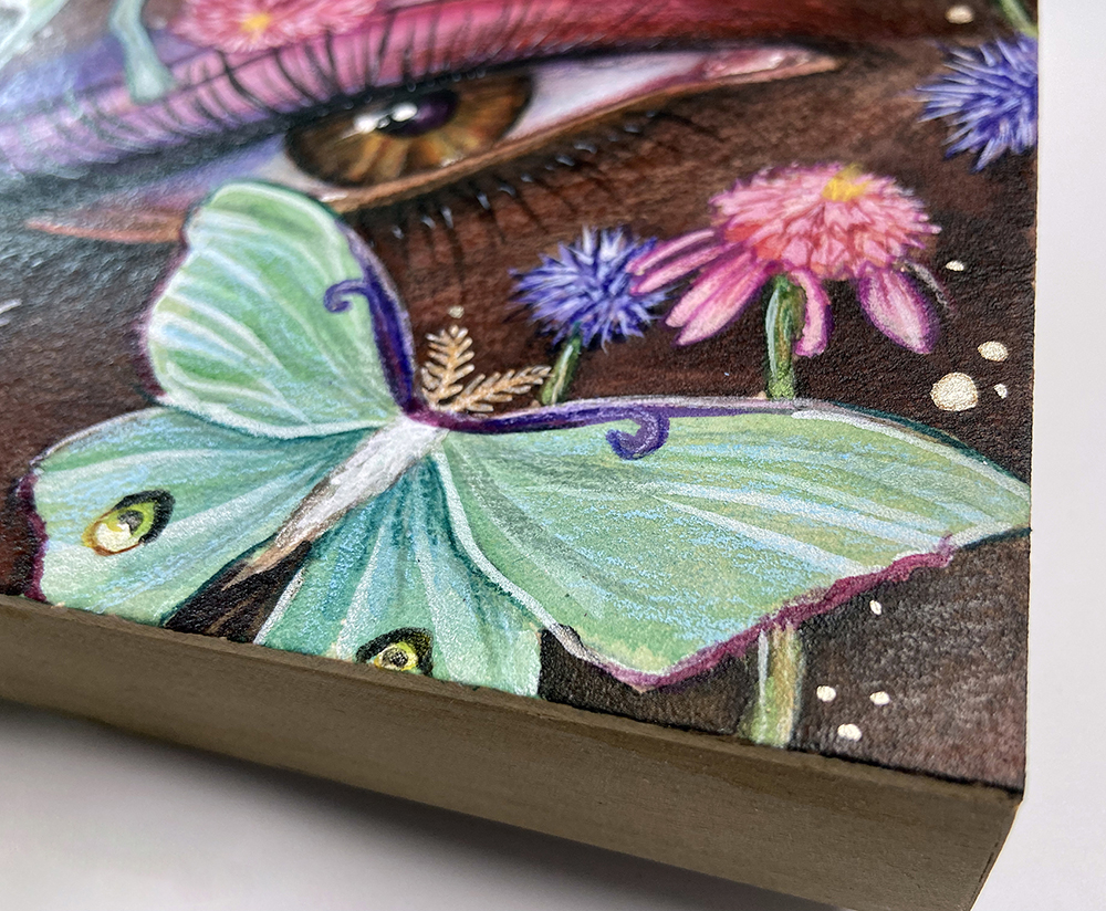 Ampersand helps make my job easier because the surface is consistent and high quality. I mainly use the unprimed Basswood cradled panels. They are extremely versatile! I use them for many different types of art, but my go-to is priming them with transparent watercolor ground. Mixed media watercolor works on top like a dream, and of course, you’ll get the added bonus of having the beautiful wood grain show throughout your illustration. They come in a variety of sizes; I prefer the 1.5” deep edge, so there’s no need to frame!
