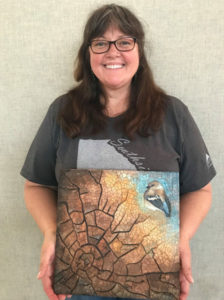 Focusing on a theme of wildlife with the texture, Kris used both Ampersand Primed Smooth and Primed Canvas Texture panels for her work. "I like the Canvas Texture for the crackle paste backgrounds I created. The texture on the panel allowed the paste to have something to grip while drying", says Davenport. Kris entered her first piece "Little Bird Lost" in a public venue showing at a local theatre. "I was so intimidated to show with such talented artists," says Kris. Two different patrons approached the venue to purchase the painting and Kris was able to meet the guest in Atlanta to deliver the painting and also share a bit of her story. We took advantage of the trip to Atlanta and Kris purchased her first oversized Ampersand panel. "She messaged me after the theatre contacted her about the sale and she was crying", Goguen recalls. "She assured me they were happy tears and she was just so flattered that strangers enjoyed her works."