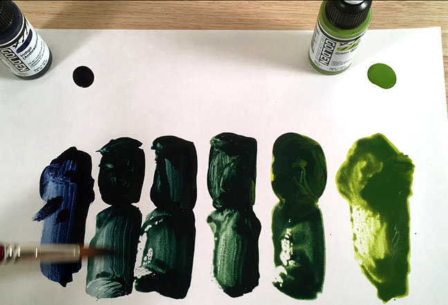 From right to left, make six puddles of Green Gold starting with 6 drops. Then 5, 4, and work down to 1 drop. Then from left to right, make the same-sized puddles with the Indigo. Mix the Green Gold puddles on the top row with the Indigo underneath to achieve a range of greens.