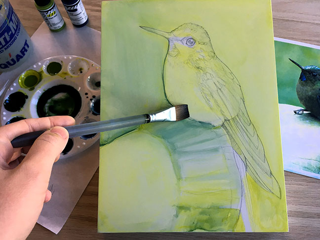 Next, is adding color to the drawing. Begin by wash layers of lighter greens, then increase saturation with darker greens and the Indigo.