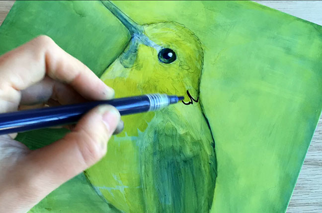 Fill a refillable marker with High Flow Indigo. Add more illustrative marks over your painted illustration. As you draw with the refillable marker, keep a few damp cotton swabs on hand to use as tools to smudge the lines. Tips: The cotton swabs can be dampened with water or a slow-drying acrylic medium. The cotton swabs can also be used like erasers to remove the paint.