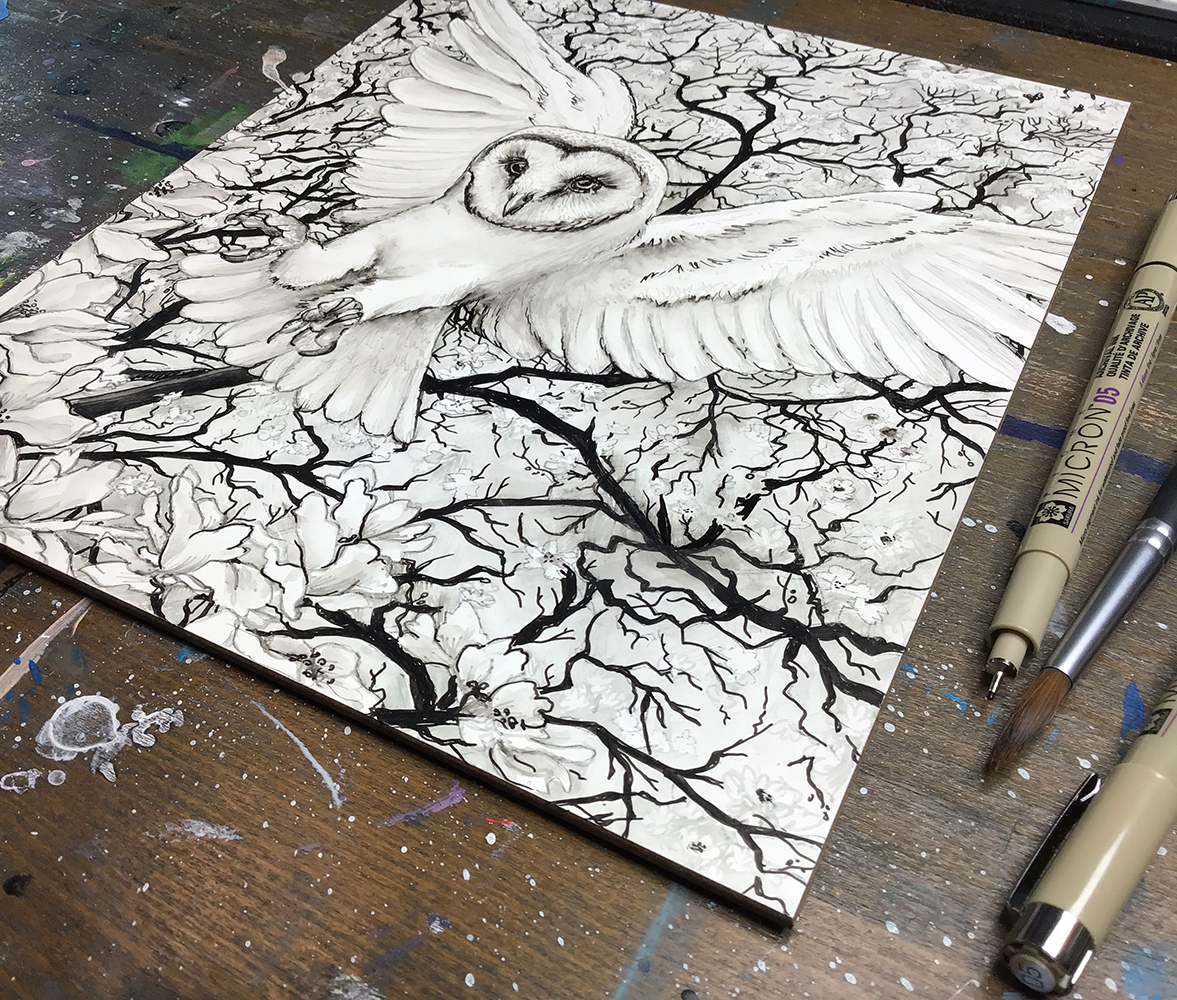 Although it seems like an unexpected combination, using Microns on Ampersand Claybord has such a unique smooth feel. The ink glides across the surface like an absolute dream. The Microns could be blended out with water, hatched or stippled with endless possibilities of layering and lining.