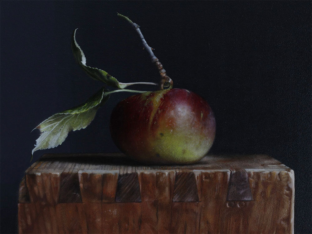 Larry Preston, Wild Apple on a Box, 14x24, oil on Ampersand Primed Canvas Texture
