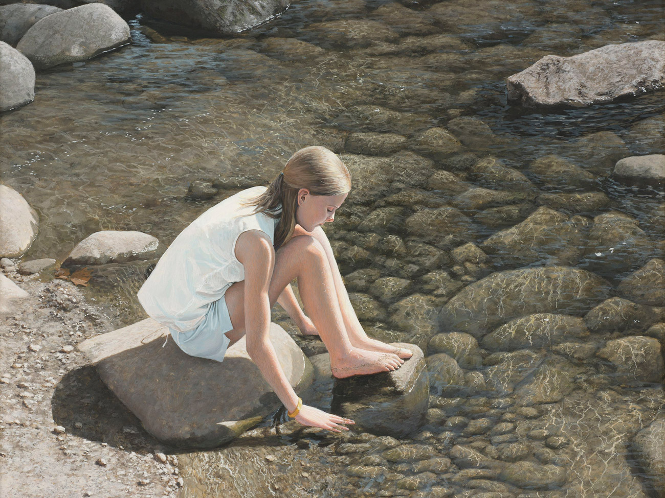 Most egg tempera work is done in a cross hatching style because the paint dries so quickly. The paint lends itself to drawing lines, rather than the soft buttery laying down that oil allows. However, Mark Meunier works his technique almost like oils, choosing a primary palette, glazing with the medium, and working realistically. Mark has taken the difficulty and tension out of egg tempera and created a technique that anyone can use.